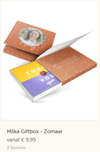 Wie houdt er nou niet van chocolade? Precies niemand, en daarom is het altijd een goed cadeau idee. Deze milka-giftbox is geschikt voor alle gelegenheden. Ook bied YourSurprise verschillende versies hiervan aan, zoals: valentijnsdag, vaderdag of zomaar bijvoorbeeld. Dit is een leuk cadeautje om te geven en te krijgen. Klik hier en bestel jouw Milka-giftbox!
